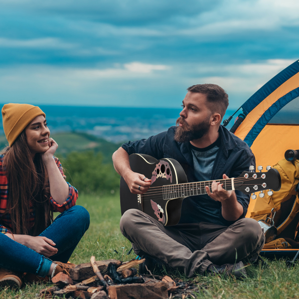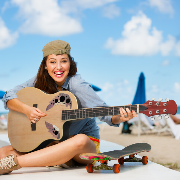 If you're looking for a stylish and high-quality guitar to begin your musical journey, the 41-Inch Cutaway Round-Back Acoustic Guitar is an excellent choice. Featuring a unique grape-shaped sound hole and an elegant round-back design, this guitar enhances sound projection for a clear, resonant tone.
