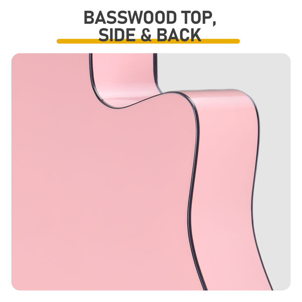 This entry-level acoustic guitar features an all-basswood base with a pink finish, revealing a delicate texture and soft, hazy feel. The entire instrument is lightweight, and the wood is dry-treated for heat and humidity resistance. Its warm, soft mid-range tone is ideal for playing and singing. Its rounded fingerboard, deburred frets, and stable nut ensure stable tuning, making it a cost-effective choice for beginners practicing or street playing.