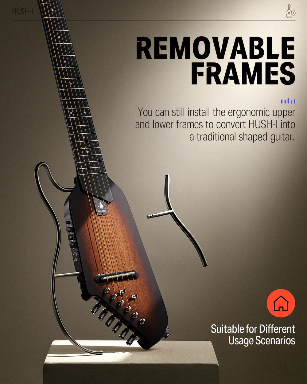 Portable Headless Structure : Headless design, bottom end tuning machines, removable frames, simple and portable