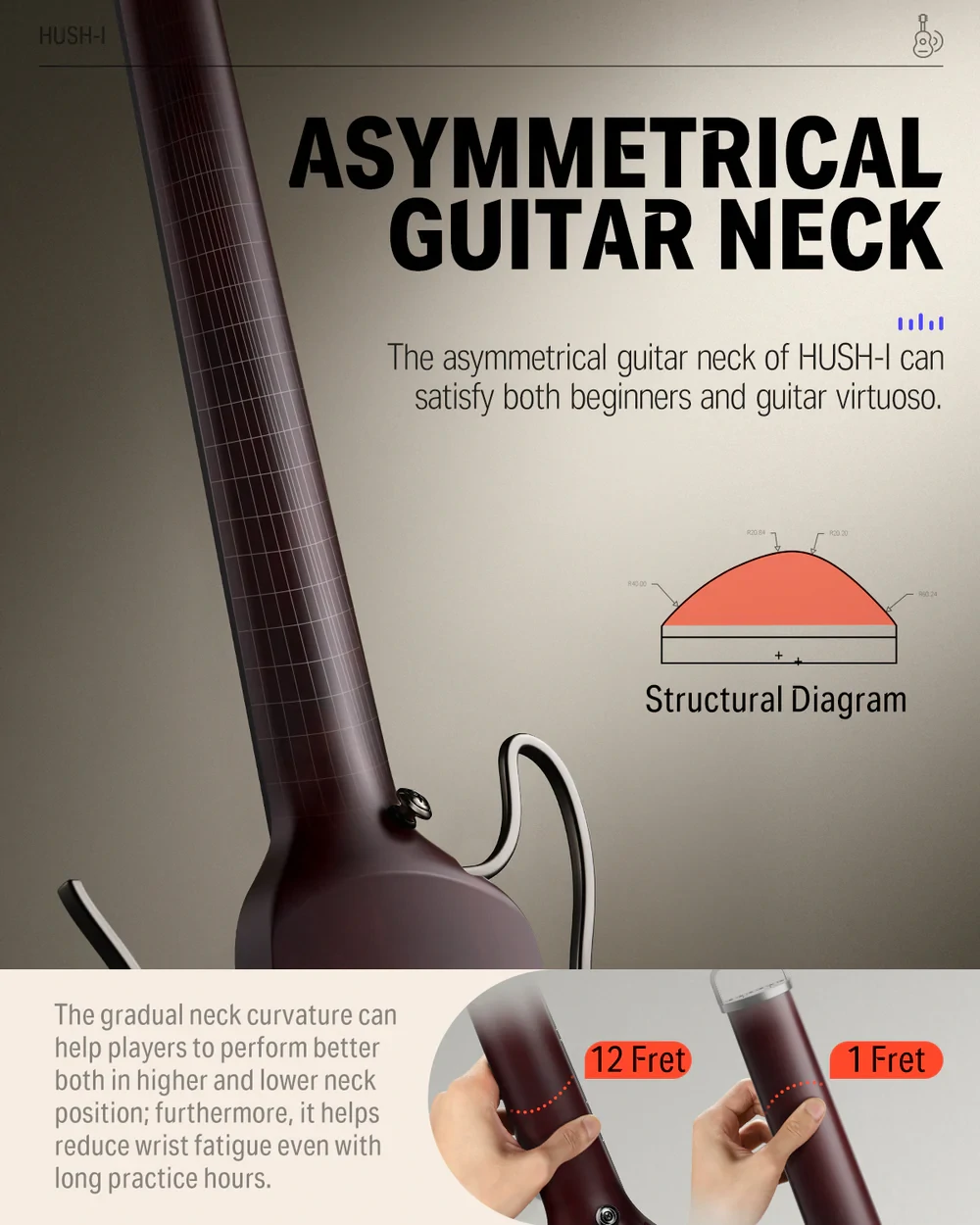 The exquisitely crafted Donner HUSH™ I is equipped with 20 customized round-edge frets that will serve to provide years of smooth playing experience right out of the box.