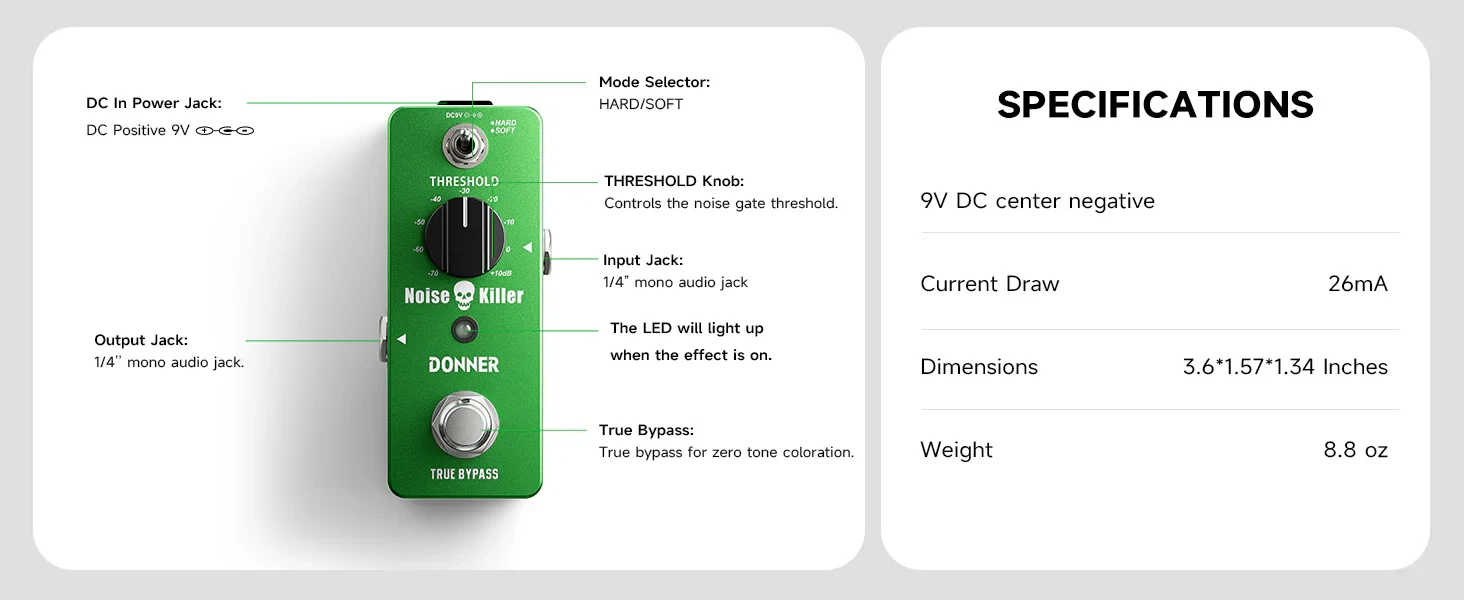 The Donner Noise Killer is an easy to use effects pedal designed to eliminate unwanted noise. Choose between a hard and soft noise gate to cater to your sound. Note: Please use a power adapter with a voltage of DC9V, an internal negative and external positive polarity and a current of 500mA or more to power your pedal. Failure to do so can cause serious situations where the product does not work or is damaged.