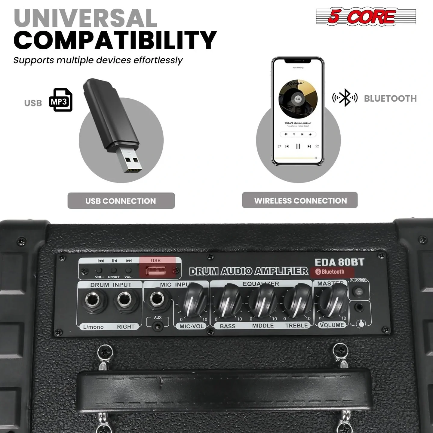 5 Core Electric Drum Amplifier 80W Professional Bluetooth Drumming Amp w 8” Speaker w 3 Band EQ