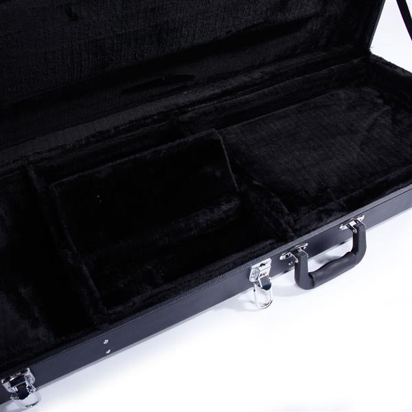 1. Lockable wood hard case with plush lined interior that includes extra neck and bridge padding