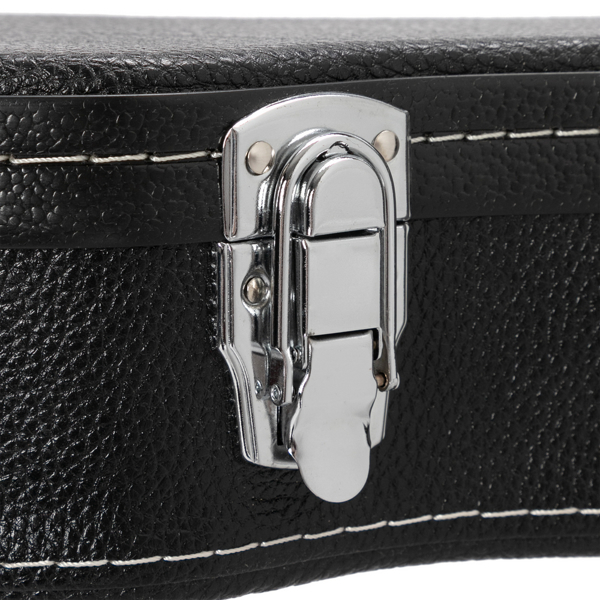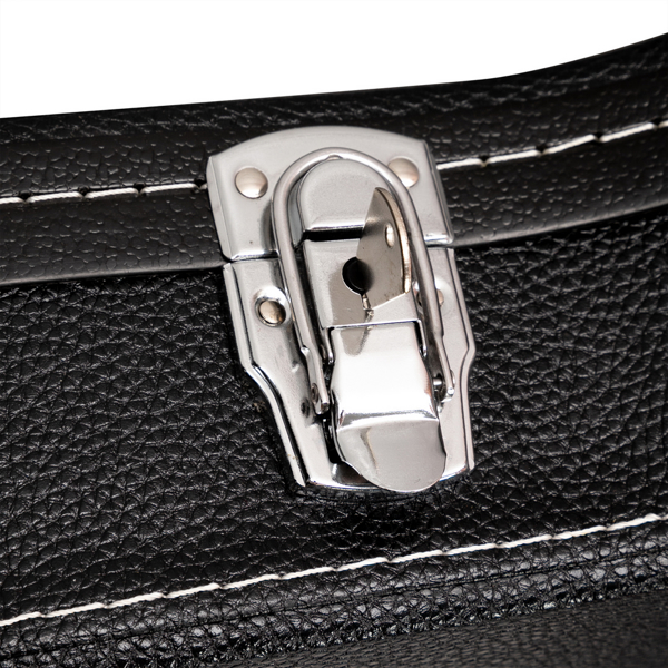 1. Lockable wood hard case with plush lined interior that includes extra neck and bridge padding
