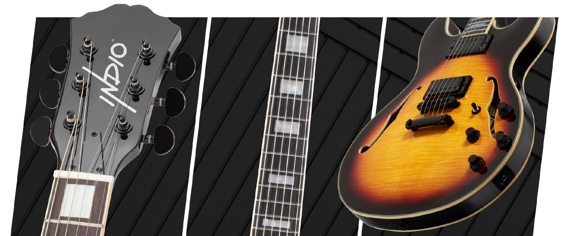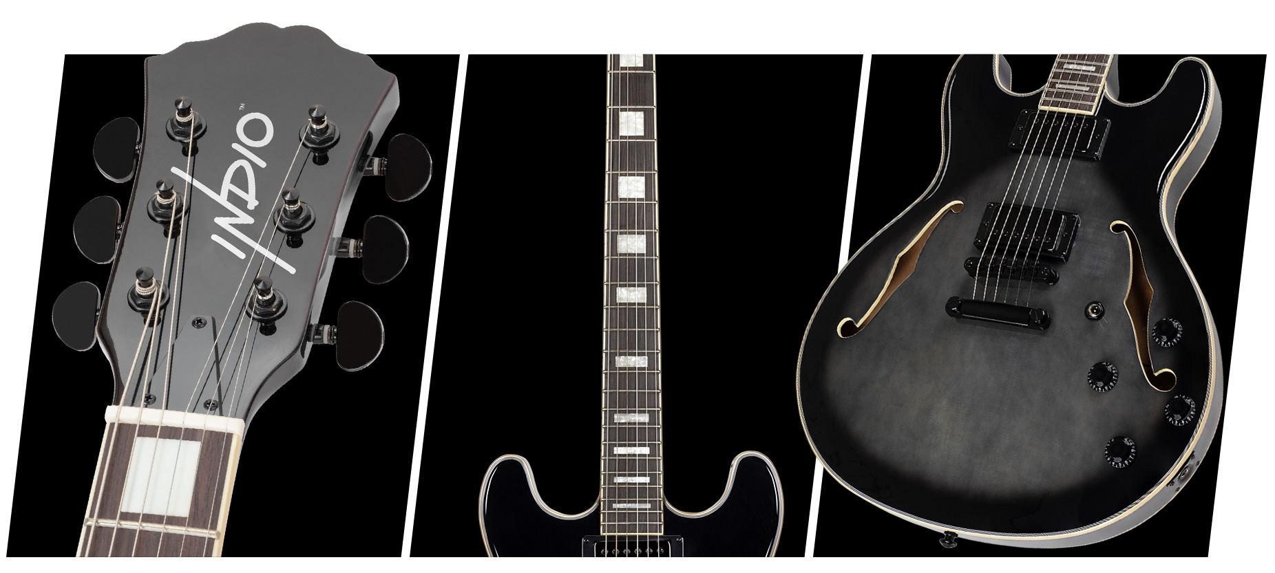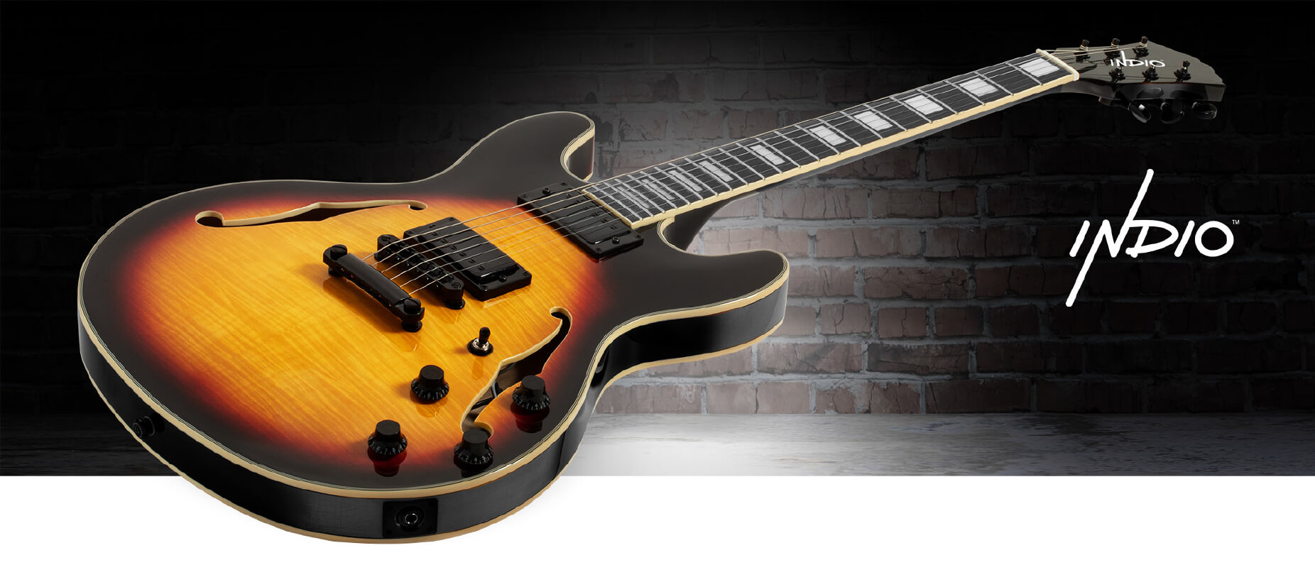 Besides practical reasons, like tone and playability, semi hollow body guitars are attractive for their looks and body design. Indio™ Boardwalk guitars deliver classic semi hollow body styling with high‑end touches only found in instruments costing several times more. Featuring a bound body and neck, block inlays on the rosewood fingerboard, and ceramic humbuckers, Indio Boardwalk guitars deliver equally in both tone and looks.