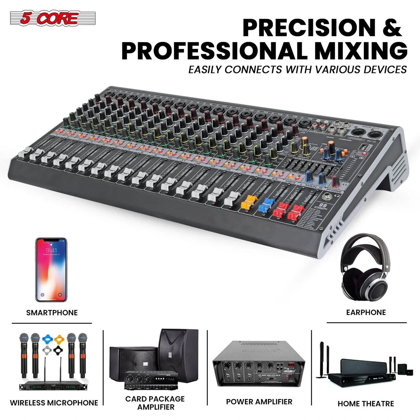 Elevate your audio experience with our cutting-edge 16 channel DJ audio mixer. Featuring 16 mono channels, this music mixer delivers unparalleled versatility for recording, podcasting, live mixing, and more. With built-in 99DSP effects and 48v phantom power.